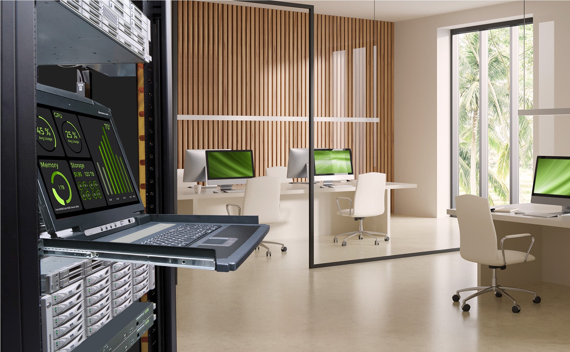 - Integrated KVM console featuring a 17" TFT LCD active matrix monitor , keyboard and touchpad