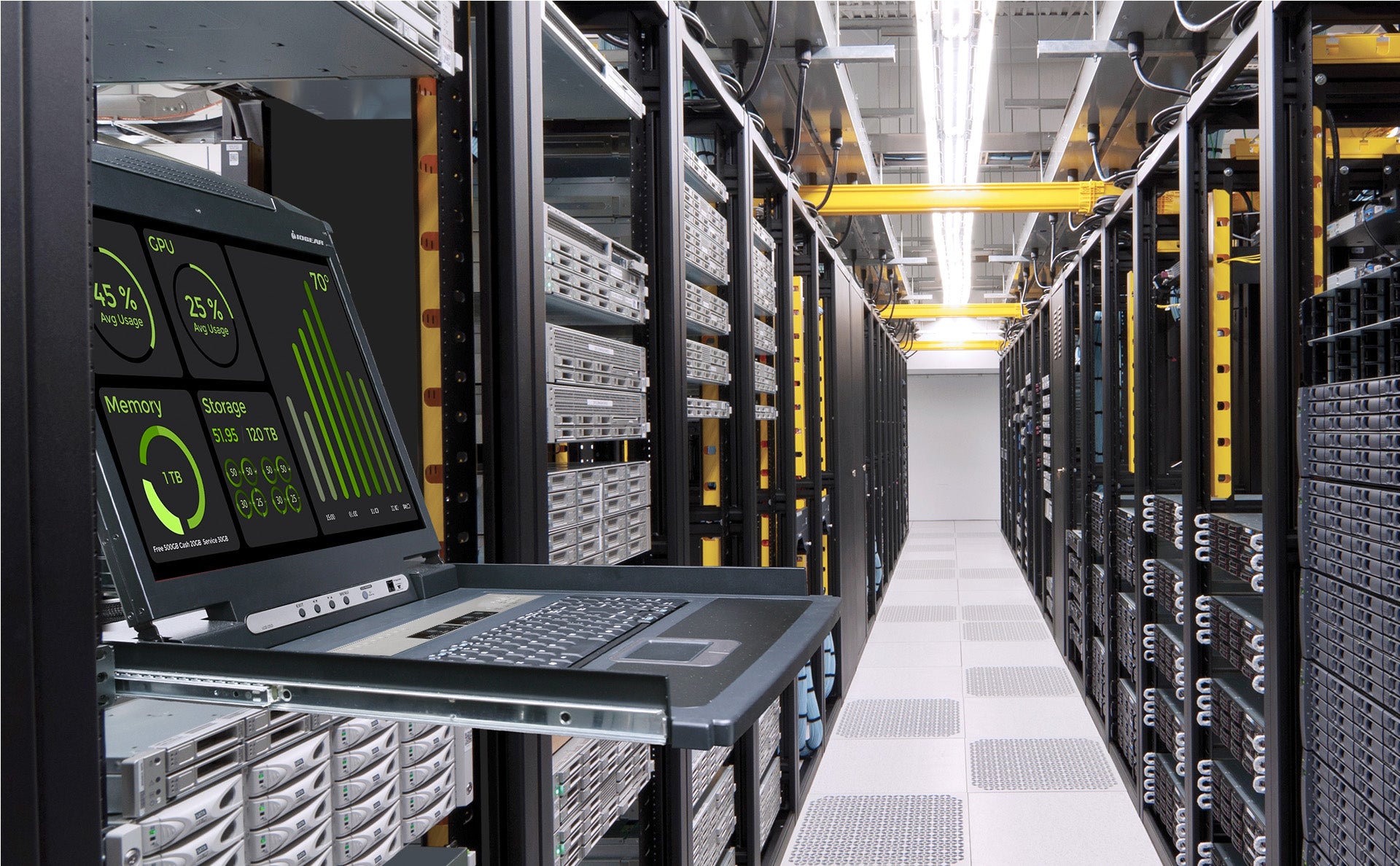 - Integrated 8-port KVM console featuring a 17" TFT LCD active matrix monitor, keyboard and touchpad