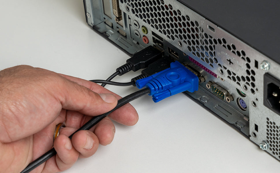 - One USB keyboard, USB mouse, and VGA monitor control two computers