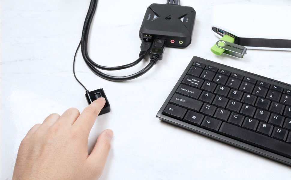 - One USB keyboard, mouse and one DisplayPort monitor control one DisplayPort and one USB-C computer