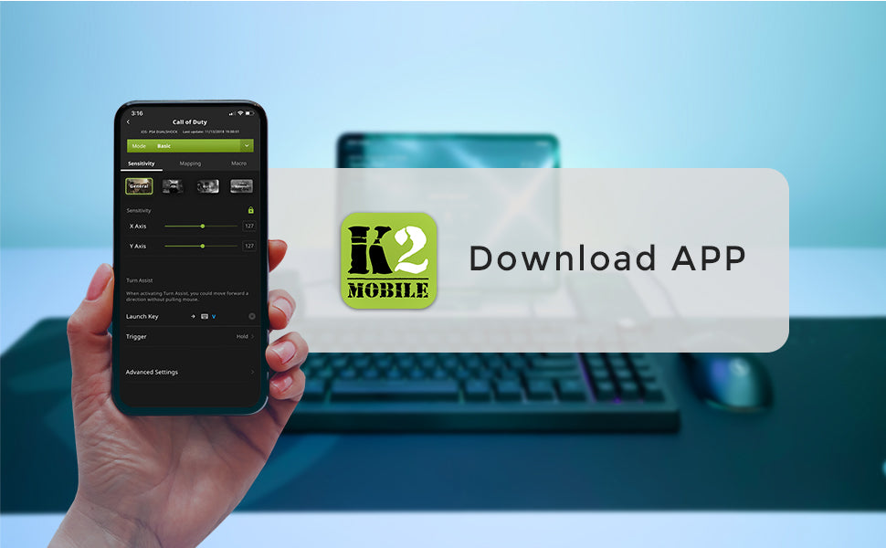- K2 Mobile iOS and Android apps provide configuration for custom key mapping, mouse sensitivity, macro functions and more