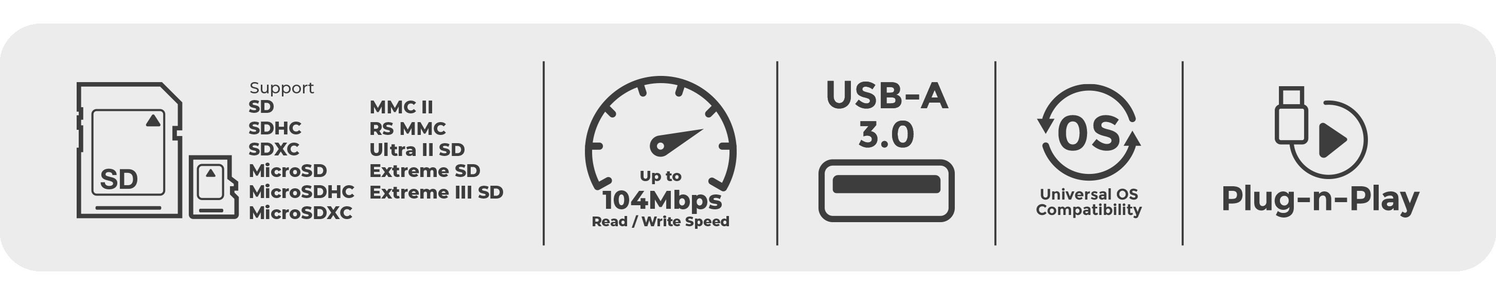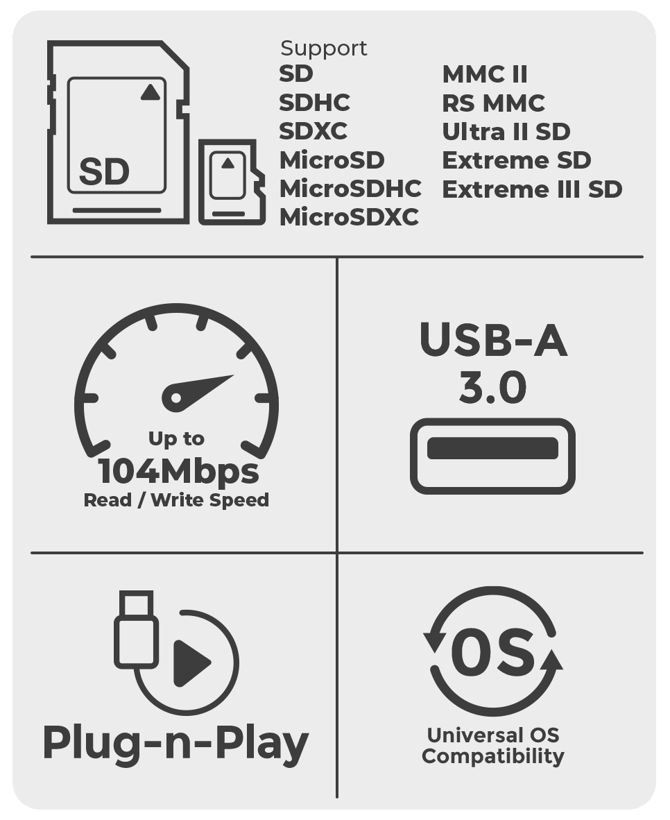 Function GFR304SD Housing Case Plastic USB Specification USB 3.0, 2.0, and 1.1 Compliant Operating System Support Windows® 8, Windows® 8.1,Windows® 10,Windows® 11, Mac OS X+ Flash Memory SD / SDHC / SCXC / MMC / MMC Micro / RS MMC* / Mini SD* / Micro SD *requires card Read/Write Speed Up to 104 mbps Power Supply Bus Powered