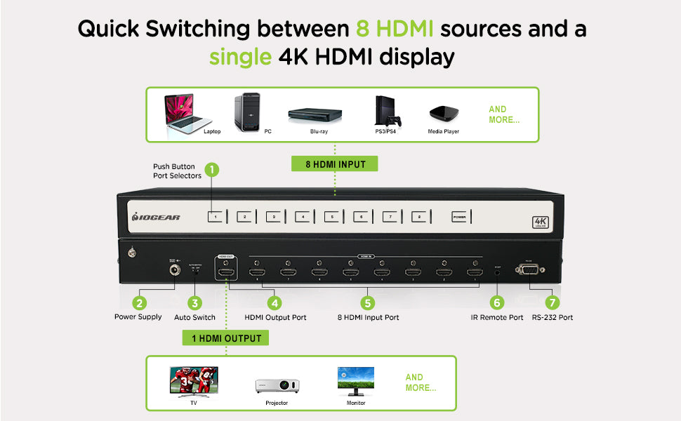 - Connect and switch between 8 HDMI sources on 1 HDMI display