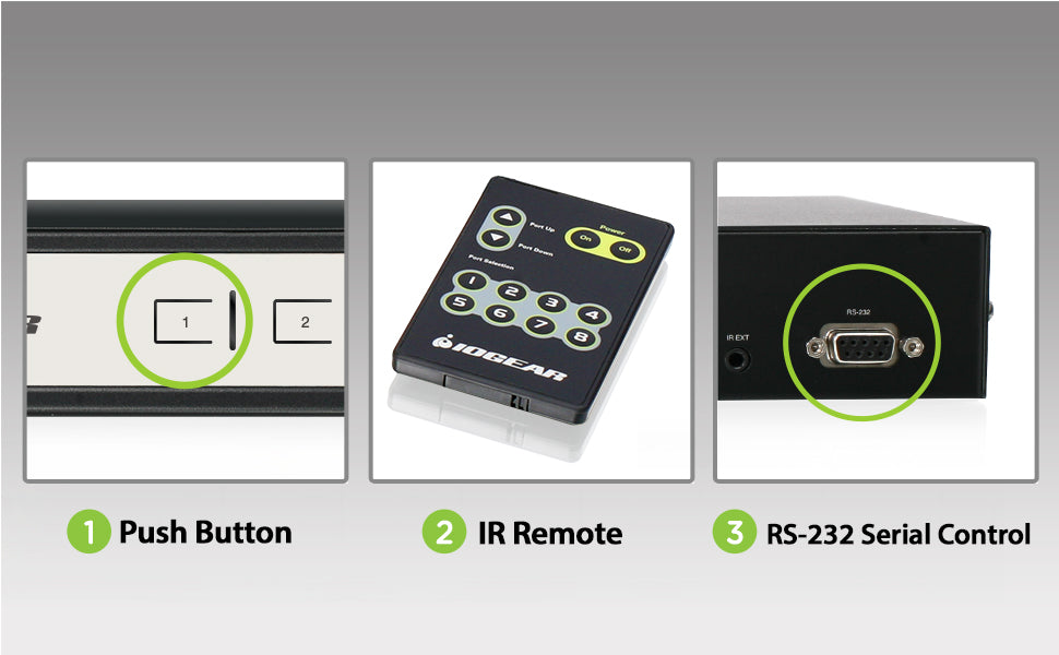 - Flexible control via push-button, IR remote & RS-232 serial control