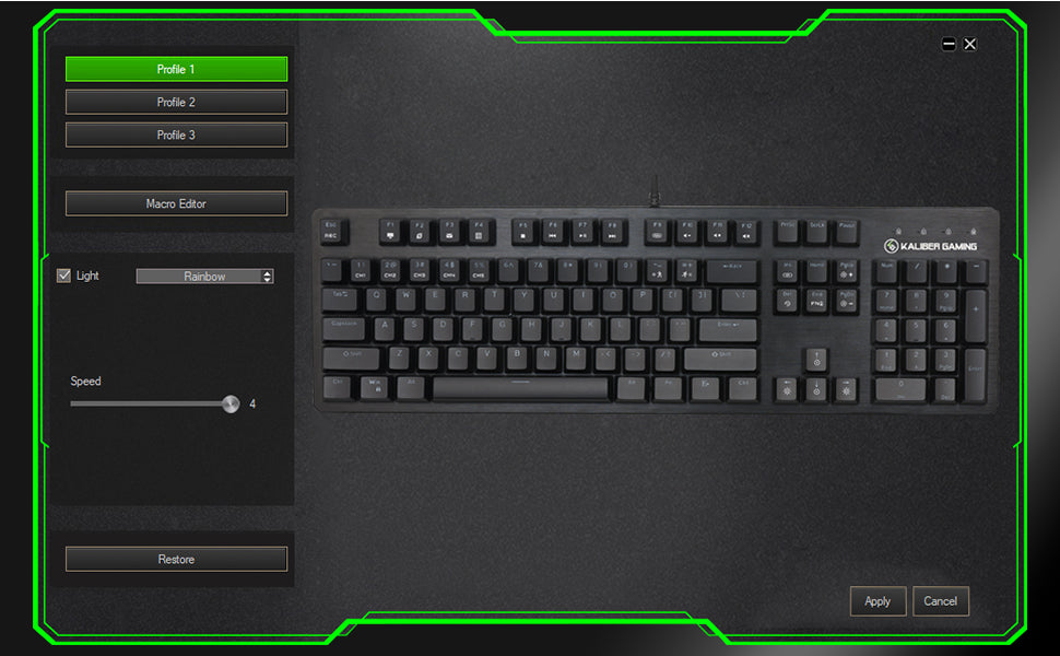 - Kaliber Gaming software to set custom backlighting and keyboard functions