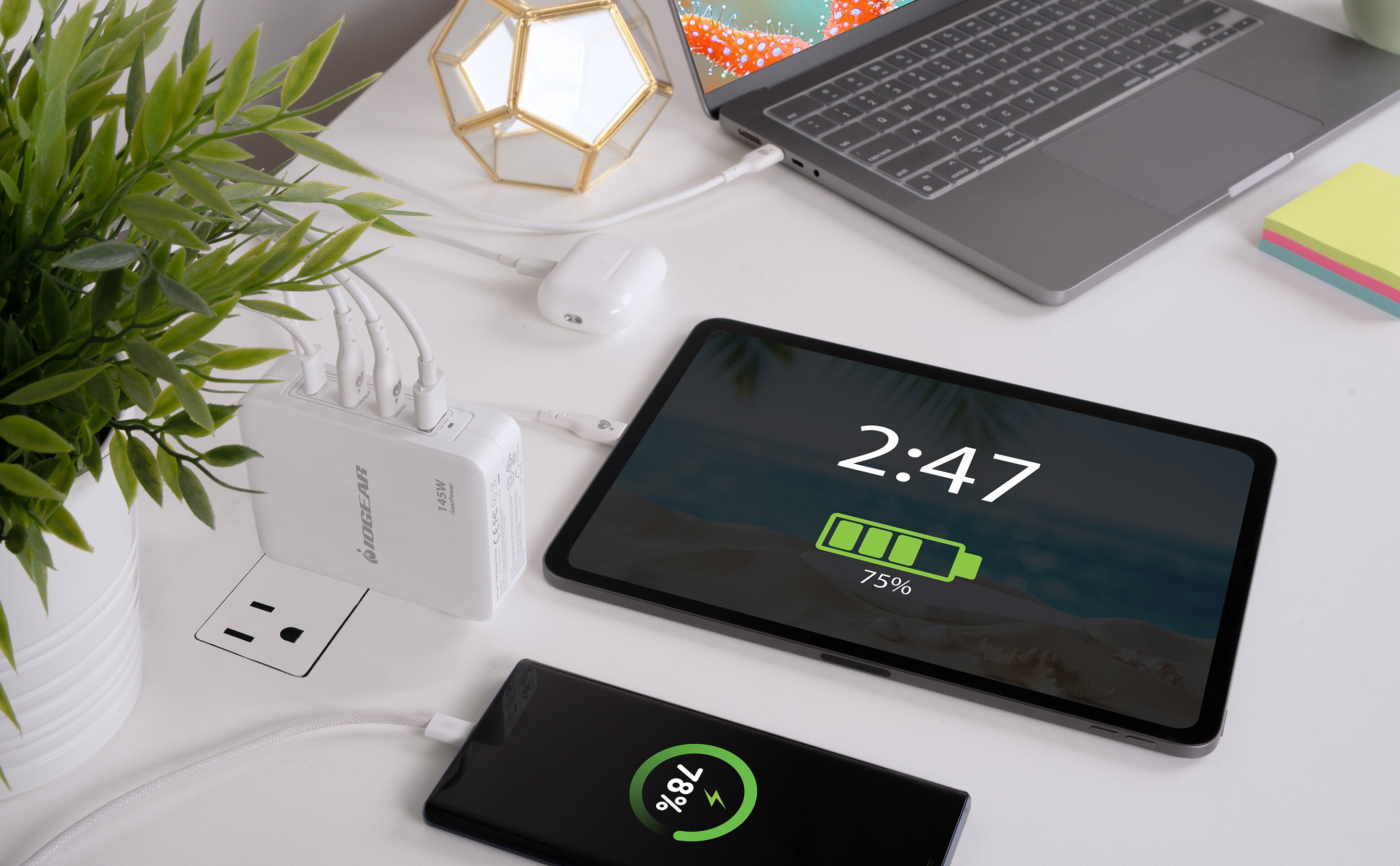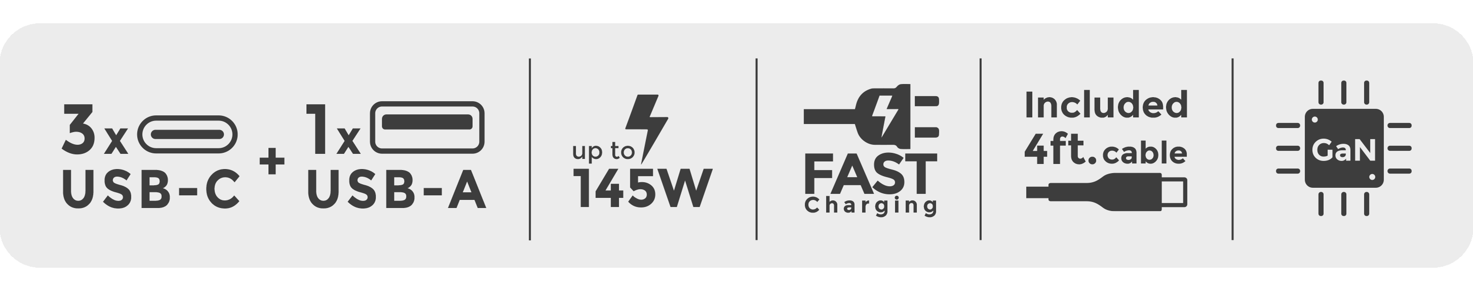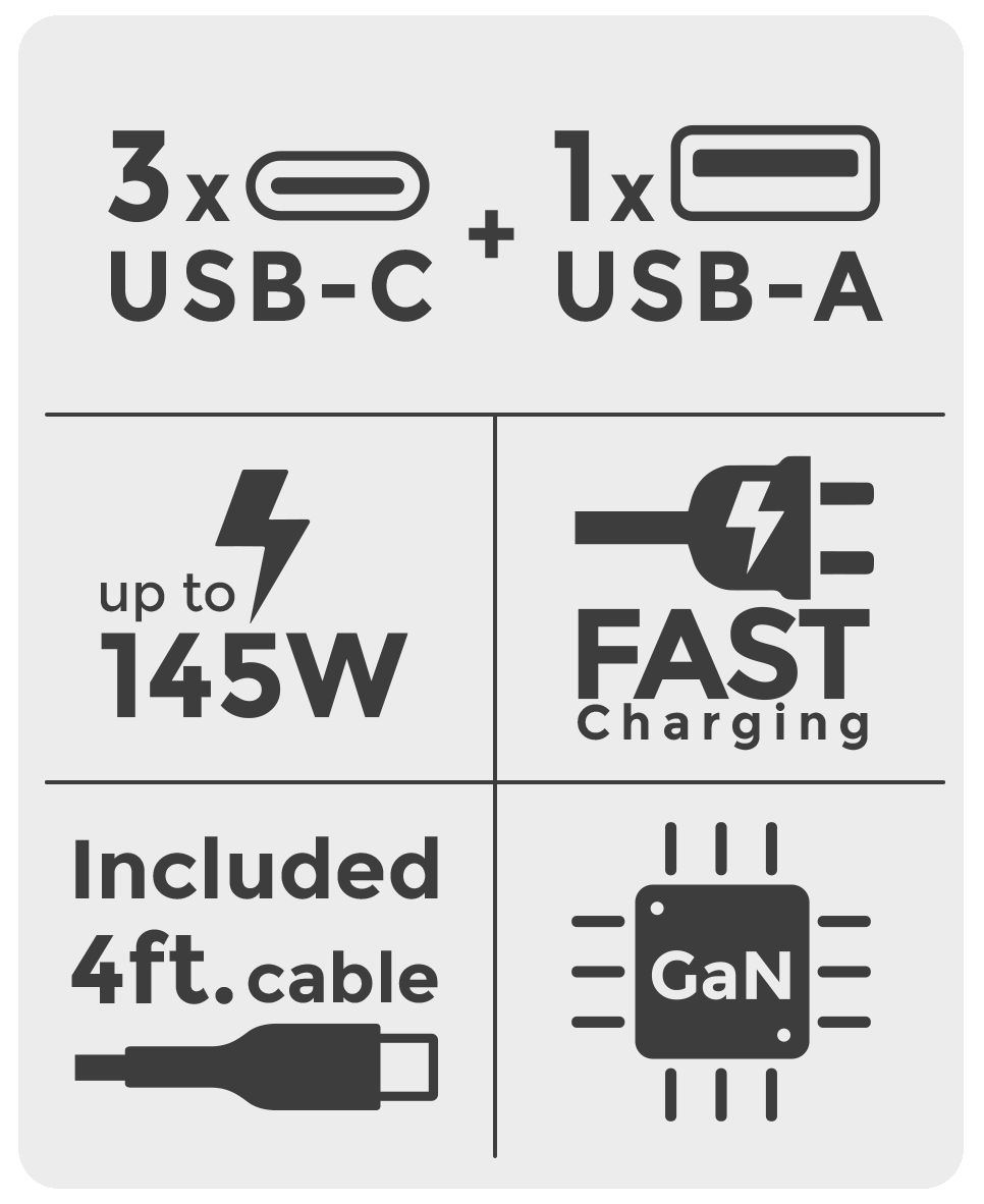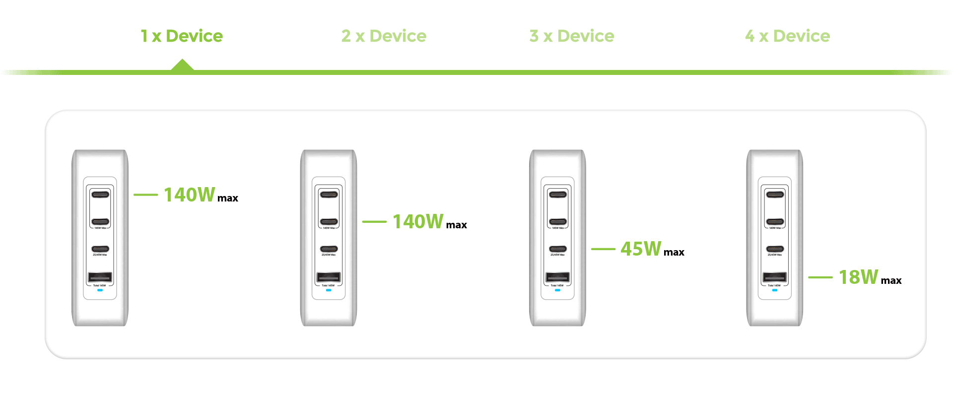 2x USB-C Up to 140W 1x USB-C Up to 45W 1x USB-A Up to 18W USB-C1/C2: 28V5A 140W Max USB-C3: 20V2.25A 45W Max USB-A4: 12V1.5A 18W Max USB-C1/USB-C2+USB-C3 Used: USB-C1/USB-C2+USB-A4 Used: USB-C1+ USB-C2 Used: USB-C3+USB-A4 Used: USB-C1+USB-C2+USB-C3 Used: USB-C1+USB-C2+USB-A4 Used: USB-C1/USB-C2+USB-C3+USB • USB-C1: 20V3.25A 65W Max • USB-C2: 20V1.5A 30W Max • USB-C3: 9V2.77A 25W Max • USB-A4: 12V1.5A 18W Max