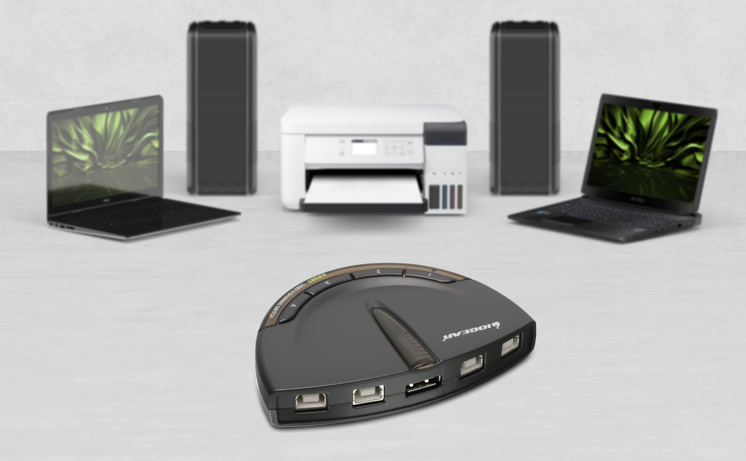- Automatically* switch from one computer to another when connecting to a USB printer or multi-function printer