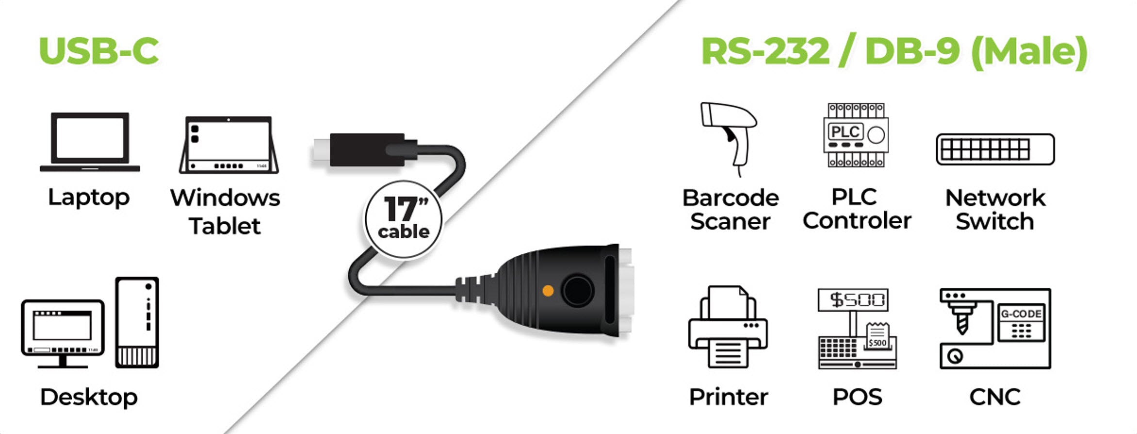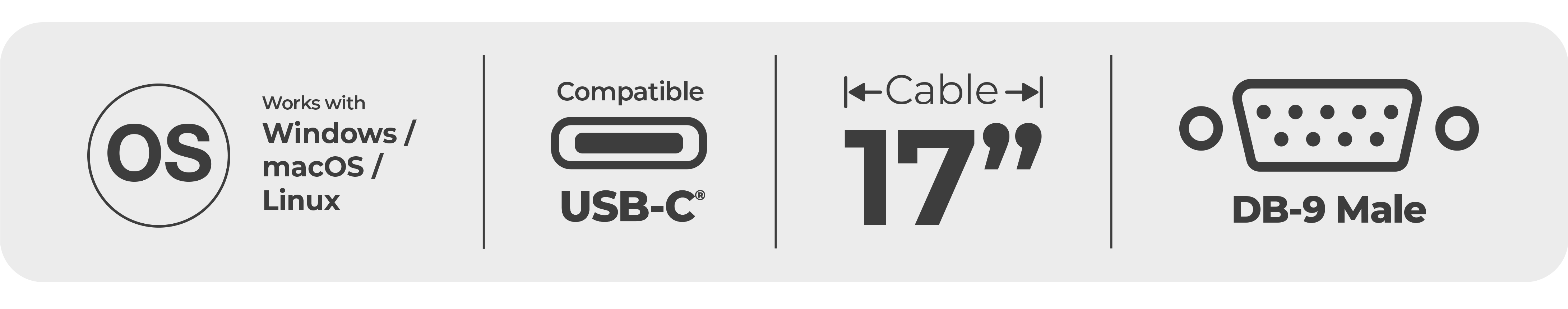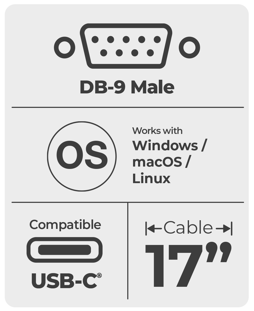 GUC232C Plastic 90mA 1 1x USB-C Male (Host) 1x DB-9 USB 1.1 compliant Up to 921.6Kbps 17.7 in (45 cm) 32 to 104 degree Fahrenheit -4 to 140 degree Fahrenheit 0-80% RH, (Non Condensing) Bus powered GUC232C