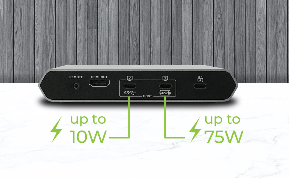 Power up your USB-C KVM switch with your laptop's USB-C power adapter or a certified, USB-C Limited Power Source (LPS) adapter (not included) to experience convenient power delivery. Connect your USB-C laptop to primary port #1 to get up to 75W of power and your second USB-C device to the secondary port #2 for up to 10W of power. For maximum charging power, we recommend using a 100W USB-C power adapter.