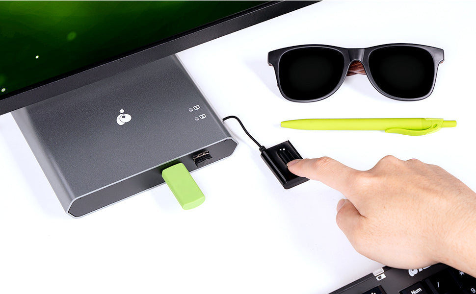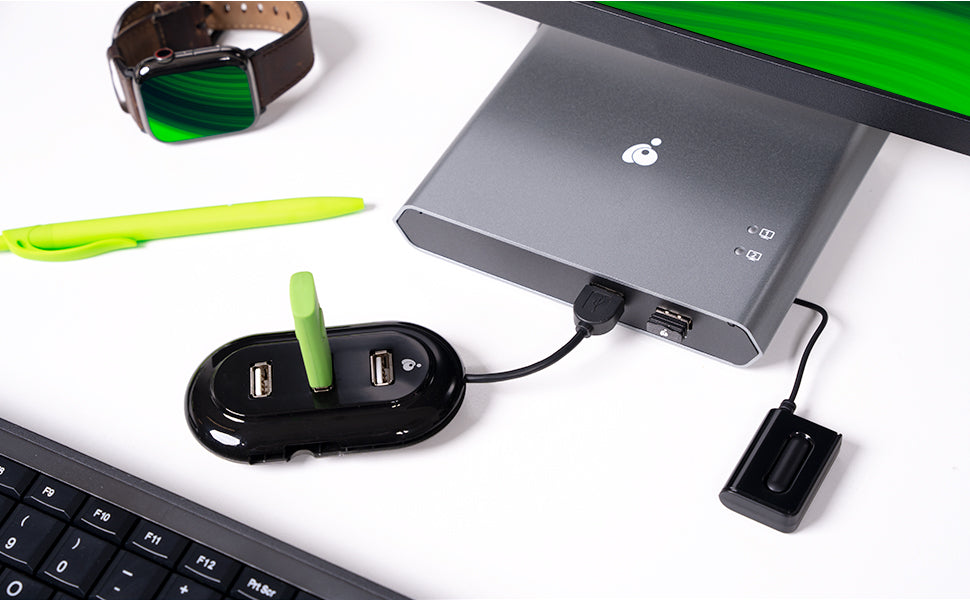 The Access Pro offers fast installation and simple operations - just plug it in and push to switch! Extend your USB-A peripheral connectivity through the KVM Switch's built-in USB 3.0 ports in the front. Hide the KVM away if needed and use the 6-foot cable push-button remote to switch between your two connected USB-C computing devices.