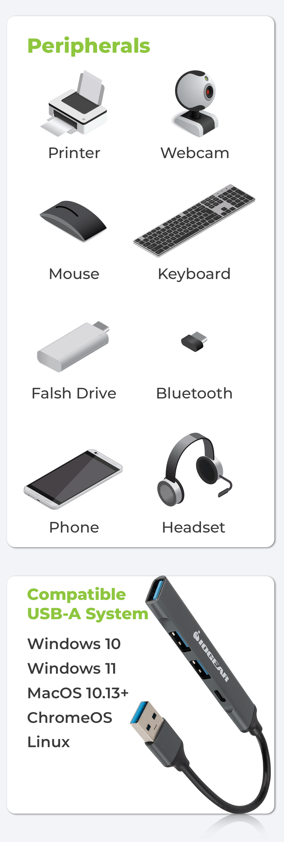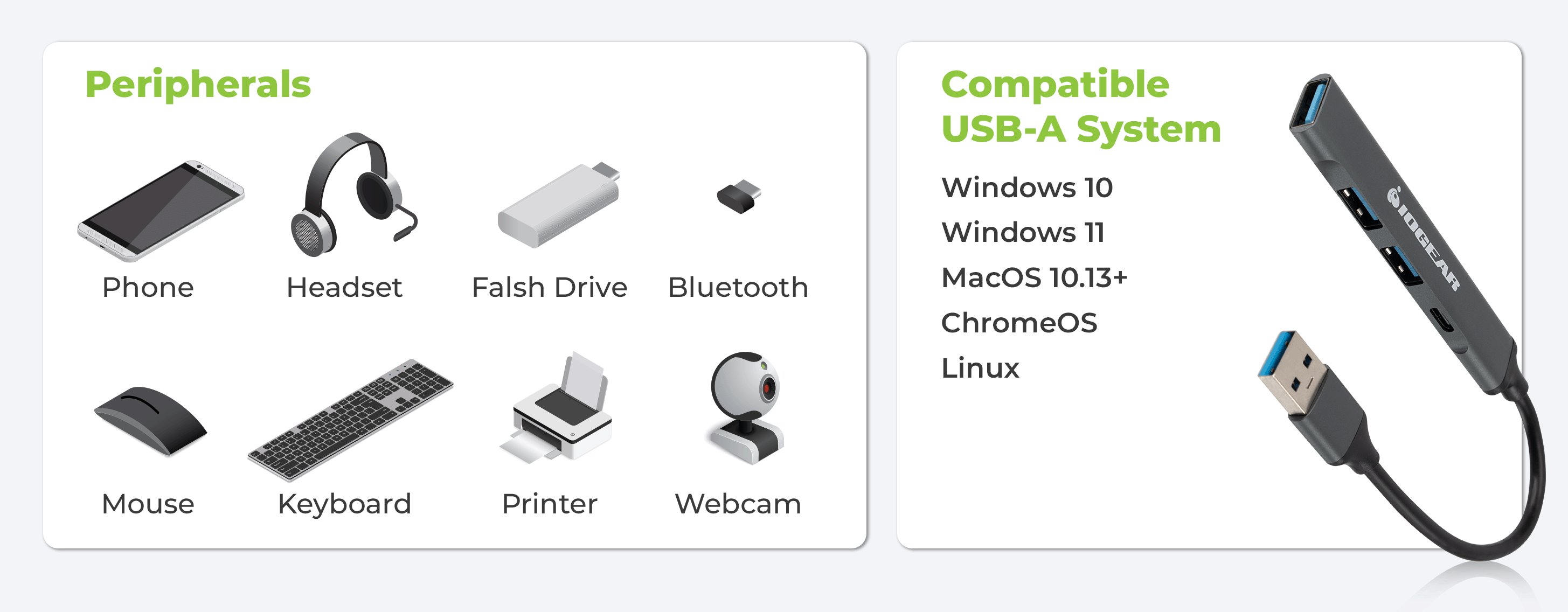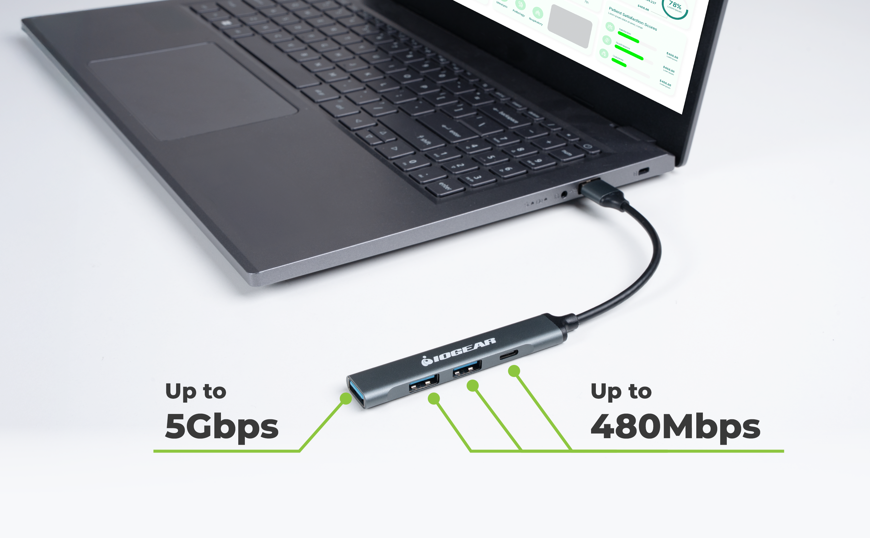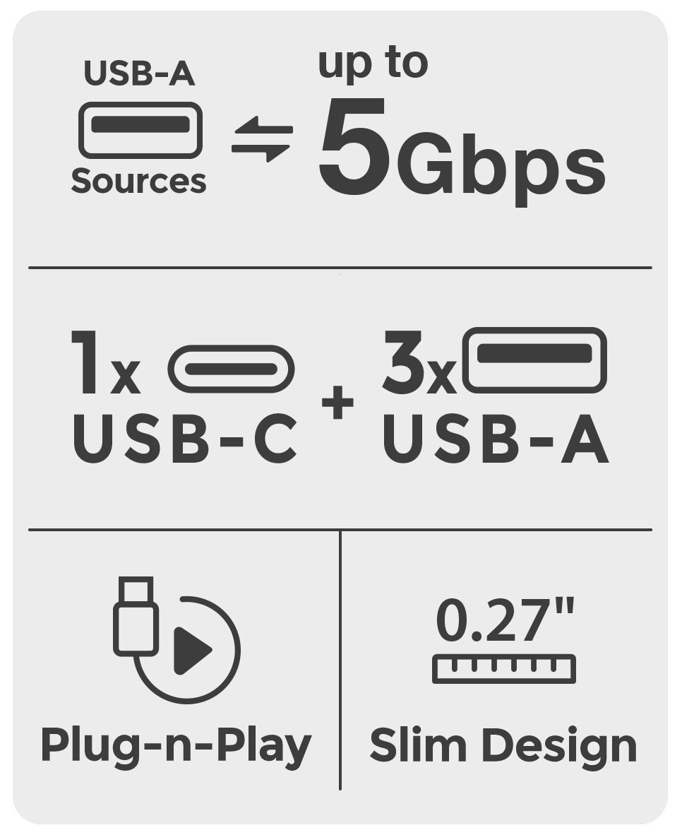 1x USB-A 3.0, 2x USB-A 2.0, 1x USB-C 2.0 Up to 5 gbps USB 3.0 Windows 10, 11, macOS 10.13+