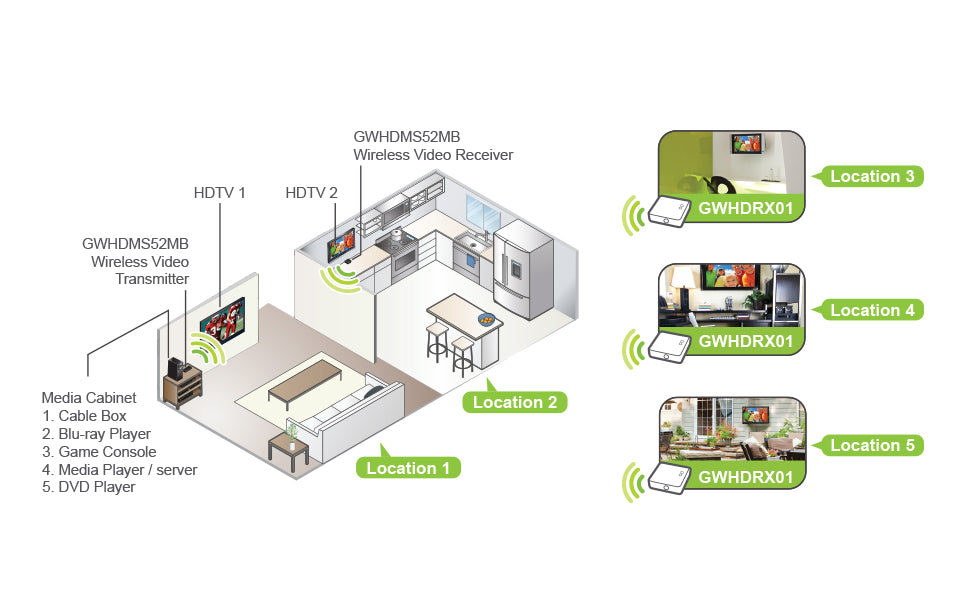 **Note: Wireless Video Receiver – Part# GWHDRX01 sold separately. Multicast Kits available. GWHDMS52MBK2 / GWHDMS52MBK3 / GWHDMS52MBK4